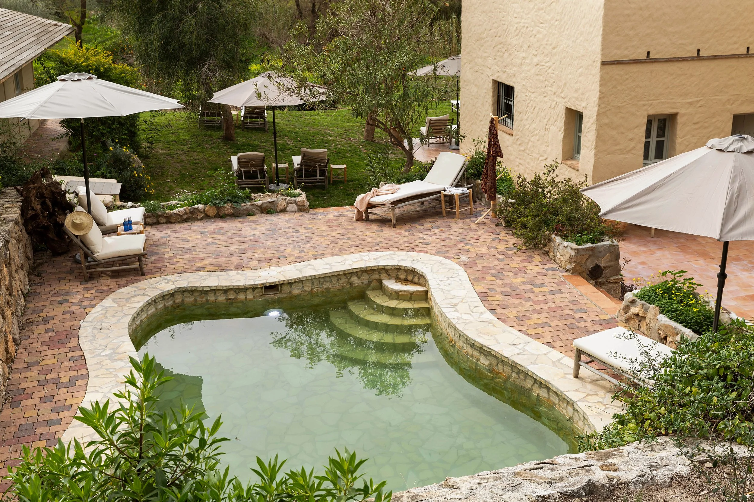 Outside, you'll find endless areas amongst the 7000m2 garden to relax; a natural water basin, many sun beds in the shade, a babbling river that flows alongside the house, and a large dining table where we plan to enjoy the last of the Summer sun and share our meals together. There is also an organically shaped pool for cooling off, and the outdoor yoga shala where our practices will be held.